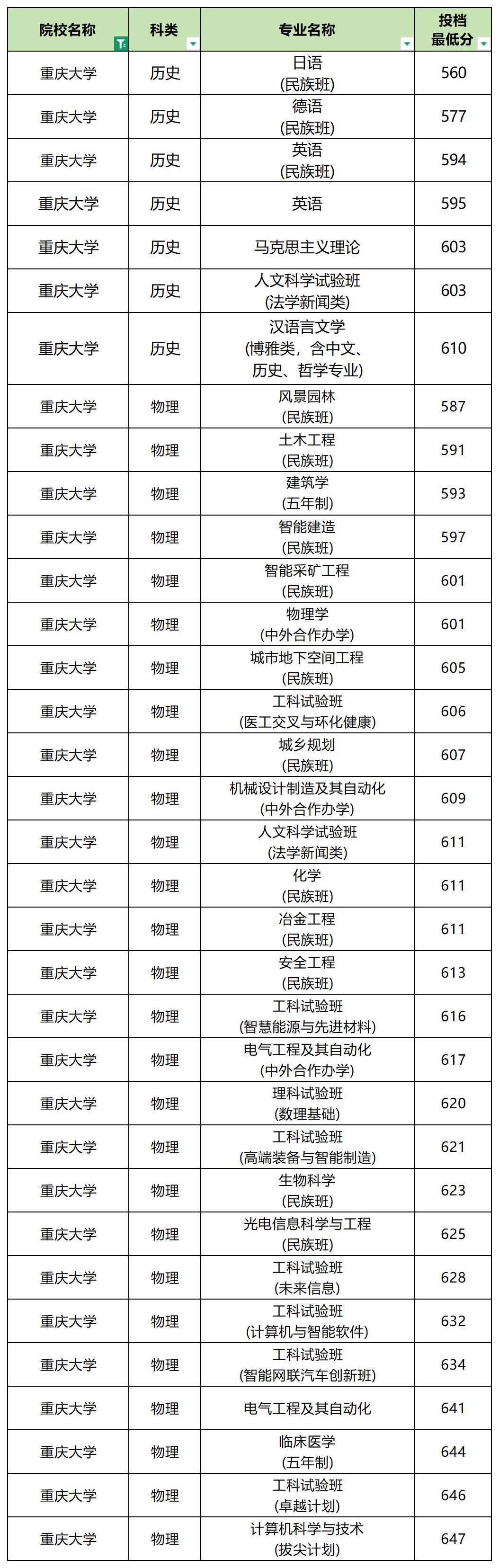 2025年重庆高考各大学最低投档分数线是:重庆大学物理类587分、历史类560分;四川外国语大学物理类487分、历史类499分;西南大学物理类536分、历史类569分等。