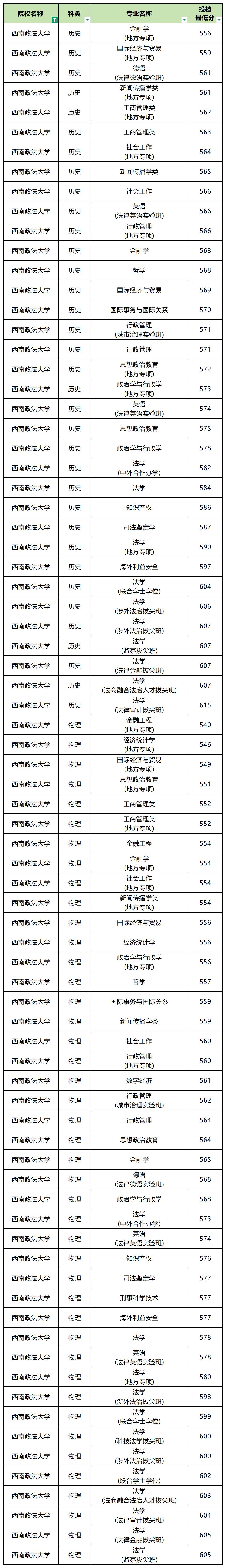 历史类分数范围:556分~615分;最低分专业是金融学(地方专项)、最高分专业是法学(法律审计拔尖班);