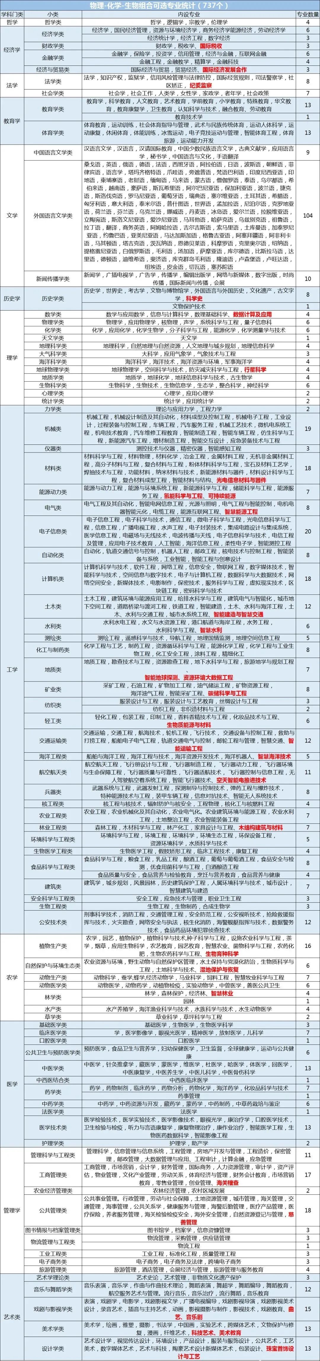 新高考选科物化生组合专业覆盖非常广,理、工、农、医、管理、艺术绝大部分专业可选,多达737个大学专业可以填报,此外人文社科类中很多专业也都可以选择。下文为大家整理了2023年新高考物化生选科专业对照表,供大家参考: