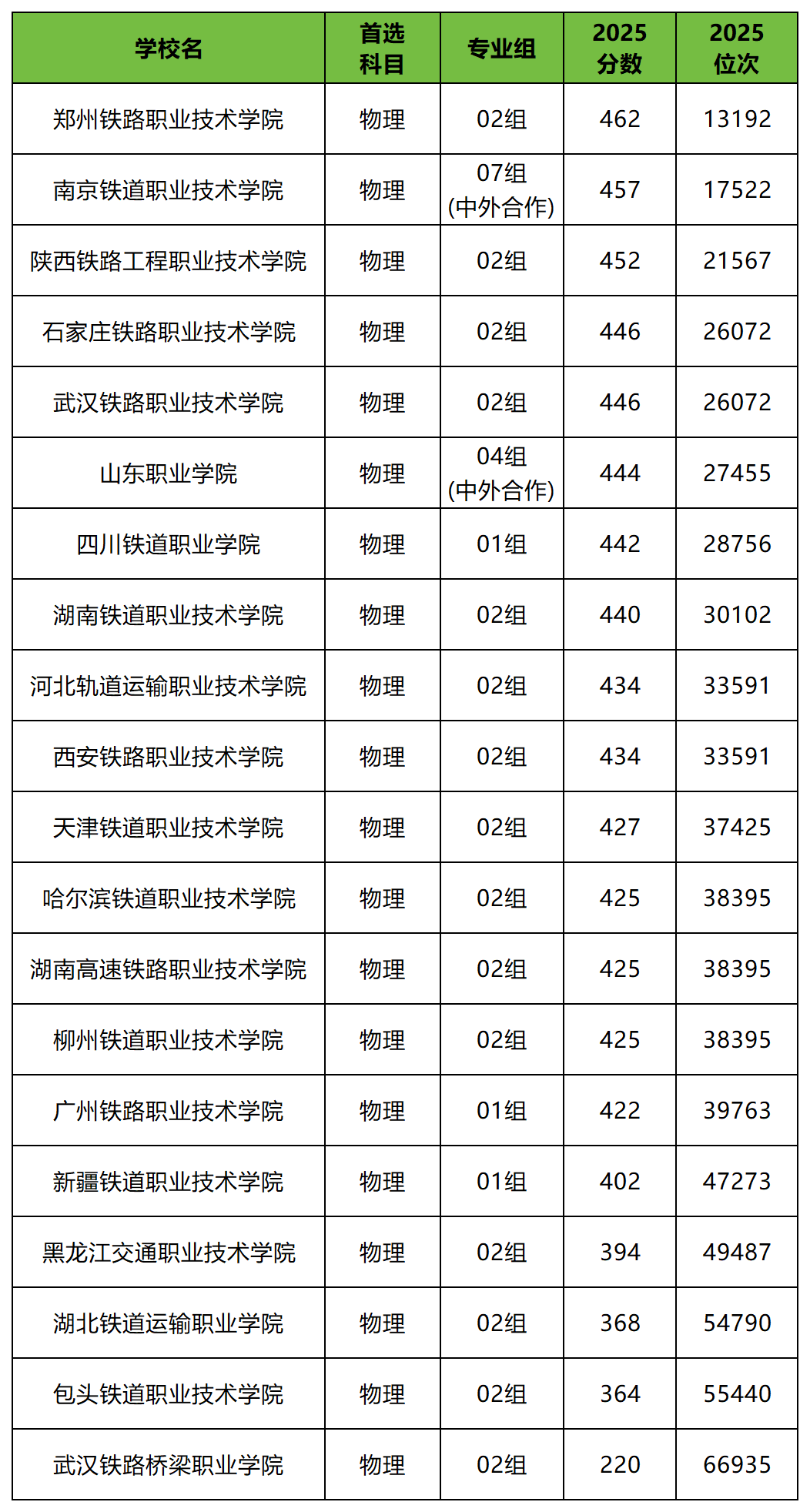另外,江苏物理类专科铁路大学录取分数最高的是郑州铁路职业技术学院(462分),录取分数最低的是武汉铁路桥梁职业学院(220分)。