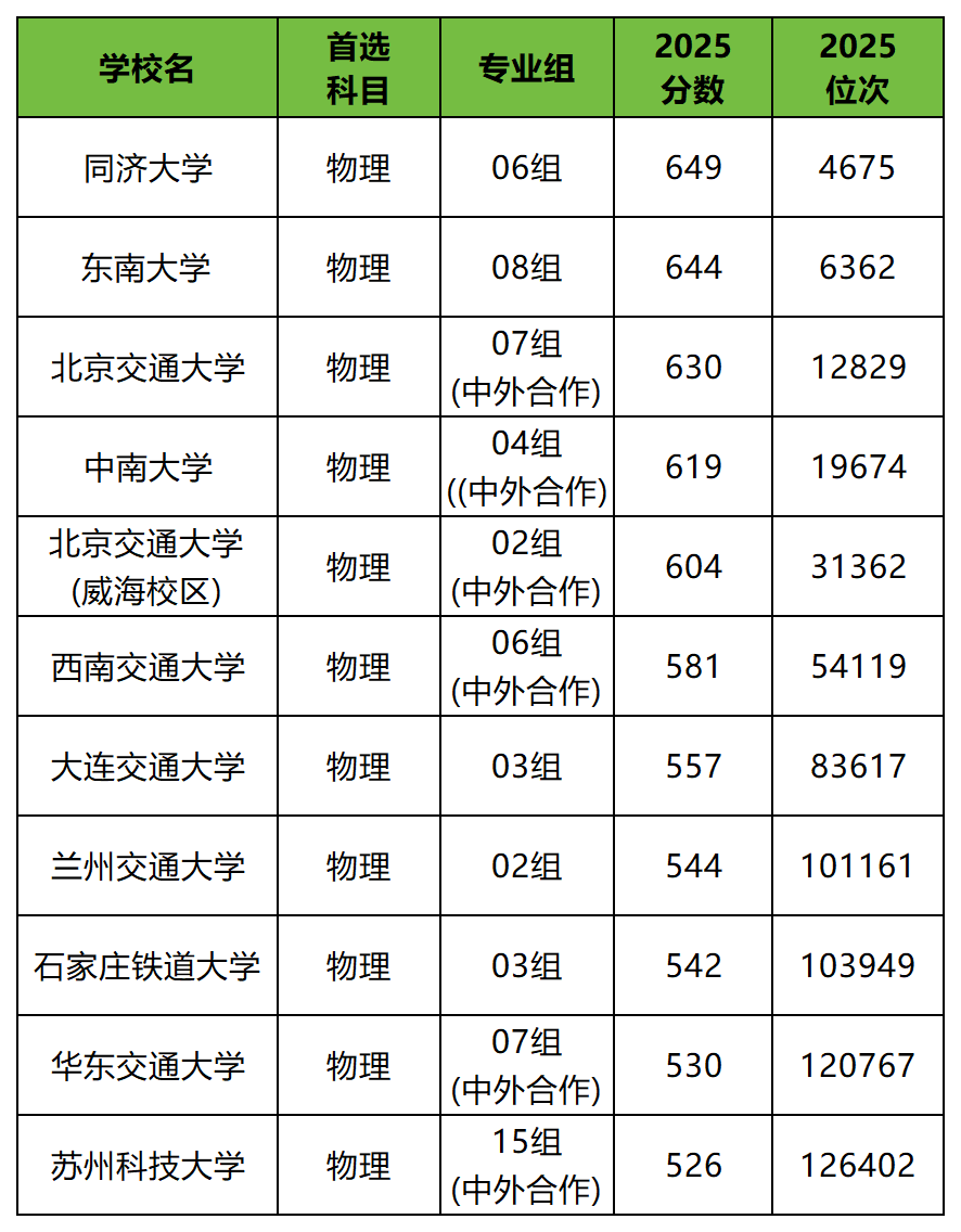 由于全国铁路大学在各省录取分数线不一样,因此本文以2025年江苏物理类招录数据为例,为大家整理全国铁路大学录取分数线排名一览表。铁路大学在更多省份录取分数线情况,可在文末输入分数查询。