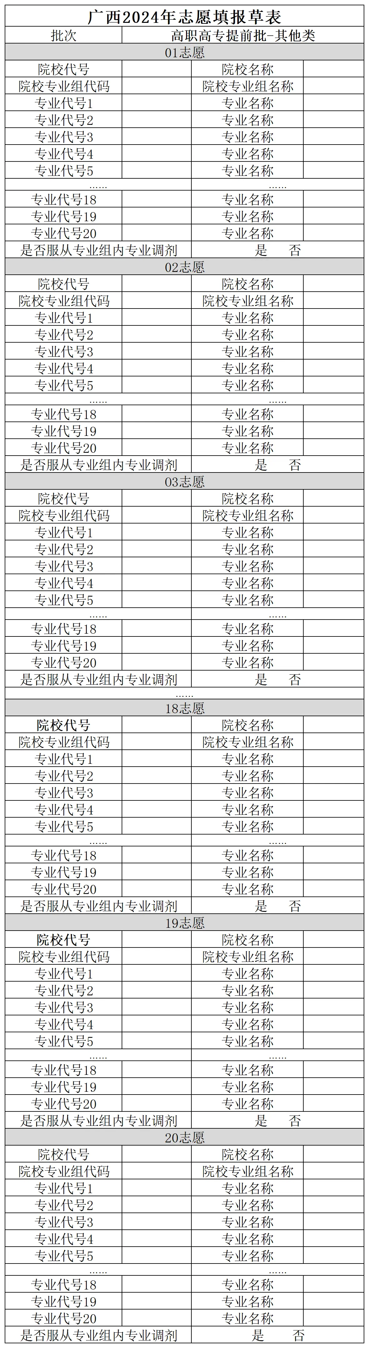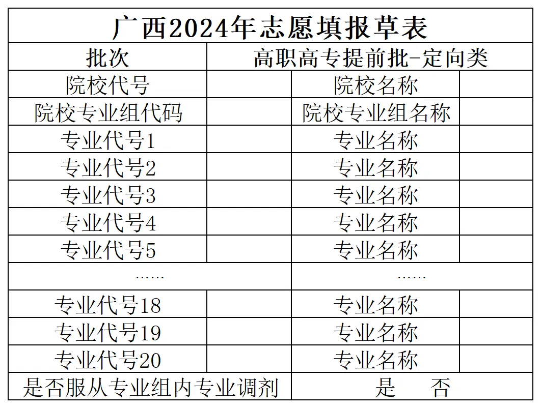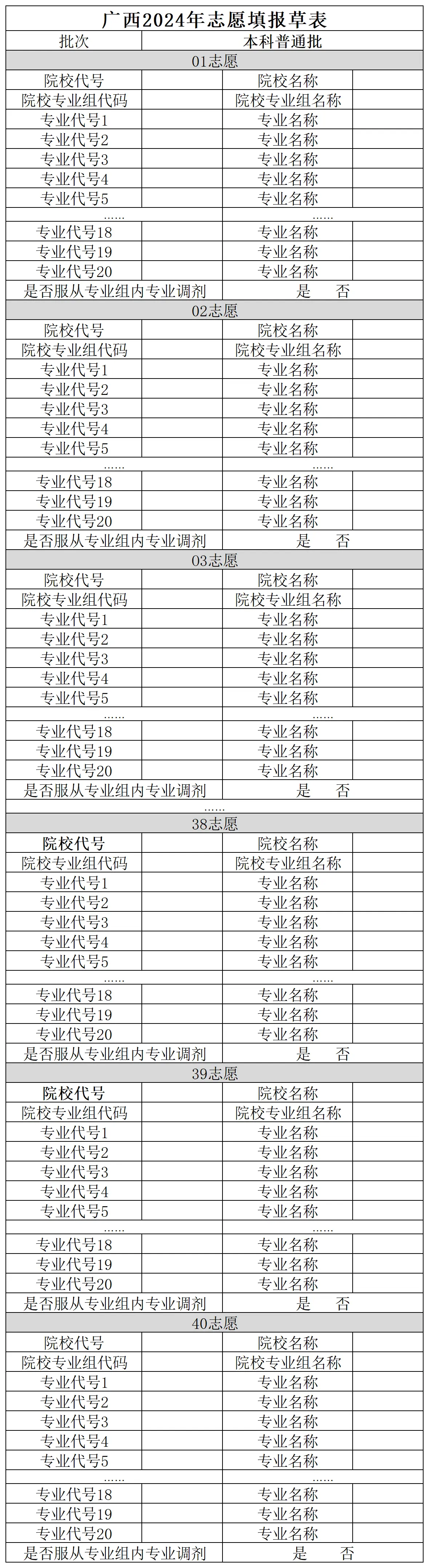 2024年广西壮族自治区高职(专科)批可填40个院校专业组志愿,可参考以下志愿表格(非官方仅供参考)。