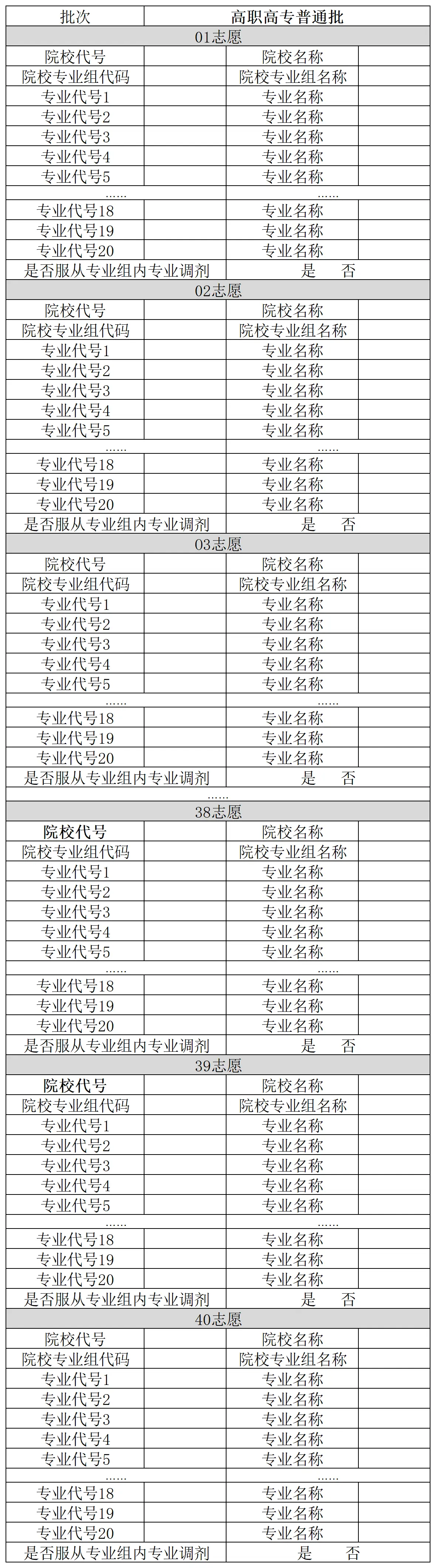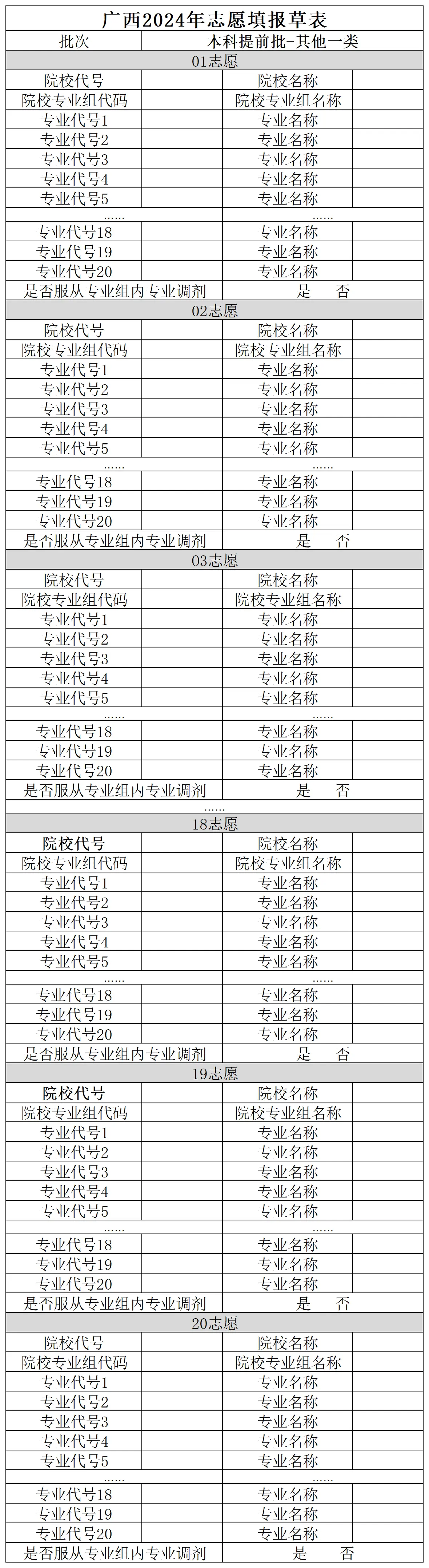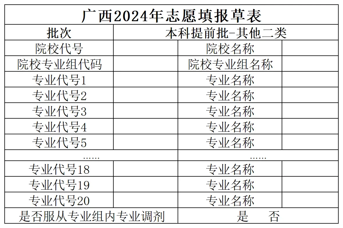 2024年广西壮族自治区高职(专科)批可填40个院校专业组志愿,可参考以下志愿表格(非官方仅供参考)。