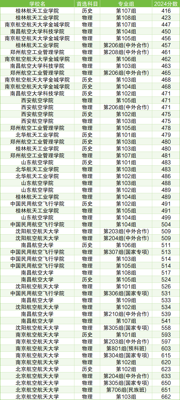 2024年全国航空航天大学录取分数线在416分~662分之间,招生专业组共计20个,其中分数超630分、录取难度较大的专业组如下: