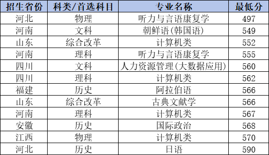 以2024年高考招录数据为例,北京语言大学高校专项计划在全国各省招生分数范围位于497分~590分之间。其中四川考生理科最低需562分(计算机类),文科最低需560分(人力资源管理(大数据应用));河北考生物理类最低需497分(听力与言语康复学),历史类最低需590分(日语)等。