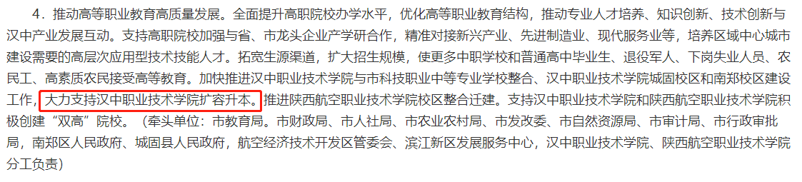 推动高等职业教育高质量发展。全面提升高职院校办学水平,优化高等职业教育结构,推动专业人才培养、知识创新、技术创新与汉中产业发展互动。支持高职院校加强与省、市龙头企业产学研合作,精准对接新兴产业、先进制造业、现代服务业等,培养区域中心城市建设需要的高层次应用型技术技能人才。拓宽生源渠道,扩大招生规模,使更多中职学校和普通高中毕业生、退役军人、下岗失业人员、农民工、高素质农民接受高等教育。加快推进汉中职业技术学院与市科技职业中等专业学校整合、汉中职业技术学院城固校区和南郑校区建设工作,大力支持汉中职业技术学院扩容升本。推进陕西航空职业技术学院校区整合迁建。支持汉中职业技术学院和陕西航空职业技术学院积极创建“双高”院校。