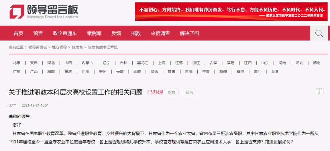有网友在人民网领导留言板询问:甘肃省作为一个农业大省,省内布局三所涉农高职,其中甘肃农业职业技术学院作为一所从1901年建校至今一直坚守农业本色的百年老校,省上是否规划将此学校升本,学校官方规划筹建甘肃农业应用技术大学,省上是否支持?推进进展如何?