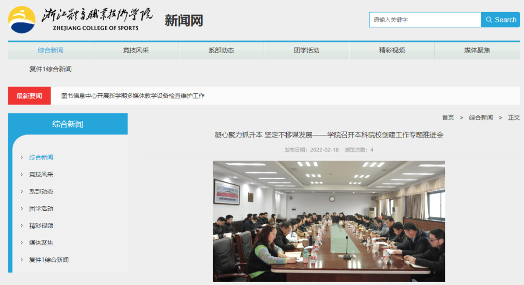 2月17日上午,浙江体育职业技术学院召开本科院校创建工作专题推进会。省体育局党组副书记、副局长鲍学军,驻省政协机关纪检监察组副组长邬建南,省体育局人事处处长卢旺忠莅临指导。