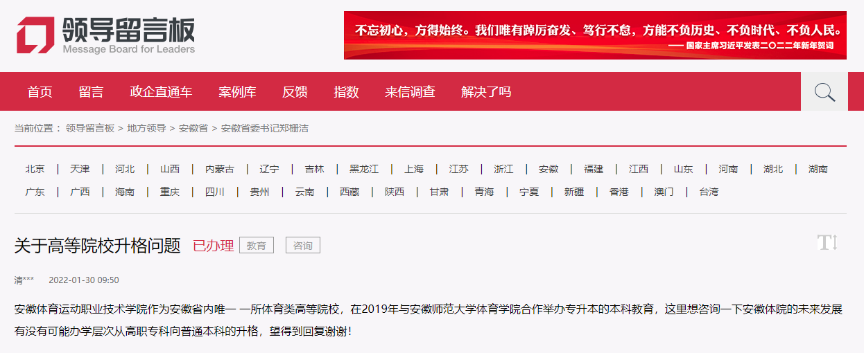 有网友在人民网领导留言板中针对安徽体育运动职业技术学院升格问题提出建议:安徽体育运动职业技术学院作为安徽省内唯一一所体育类高等院校,在2019年与安徽师范大学体育学院合作举办专升本的本科教育,这里想咨询一下安徽体院的未来发展有没有可能办学层次从高职专科向普通本科的升格?