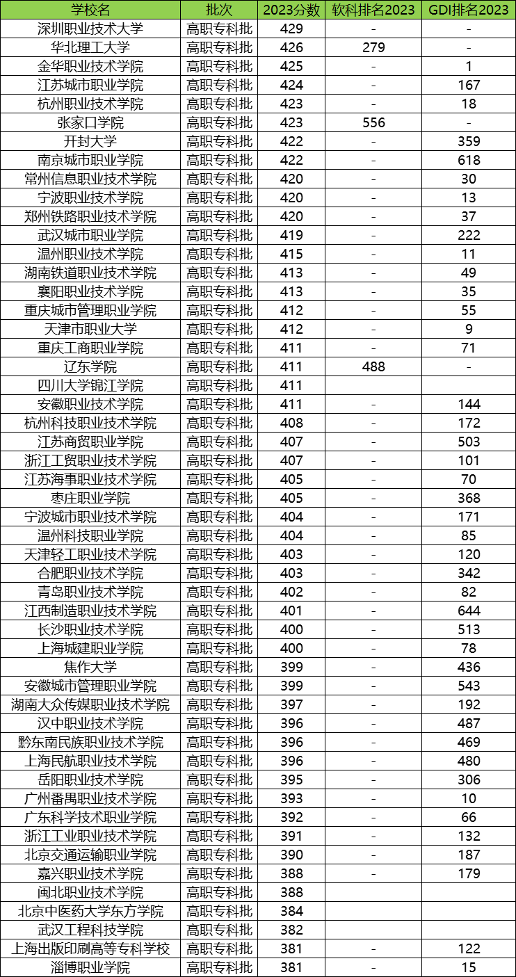 全国在综合类理科招生的290所专科批学校中(含本科带专科的大学),最难考的是深圳职业技术大学,2023最低分429分,华北理工大学(426分)同样也是分数很高、实力很好的学校。