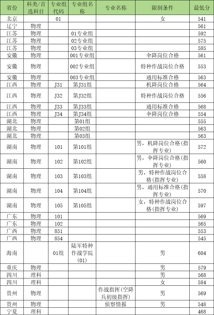 根据学院官方公布的录取数据来看,2024年陆军特种作战学院在全国进行录取,具体录取分数线情况如下: