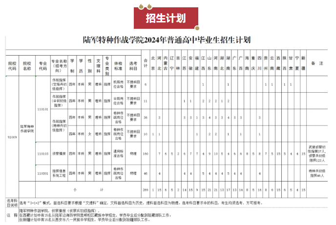 陆军特种作战学院招生简章已公布,2024招生计划269人,其中河北15人,招生专业包括作战指挥、侦查情报、指挥信息系统工程。