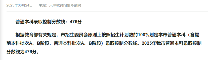 2025年天津本科划线由天津教育考试院公布: