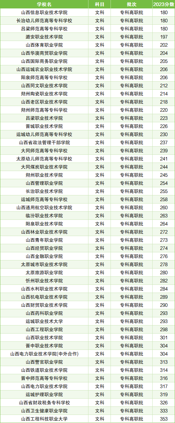 根据往年招录数据显示,2023年山西省内大专文科分数范围在180分~353分之间,其中压专科线(180分)能报考的院校有3所,分别为山西信息职业技术学院(民办)、长治幼儿师范高等专科学校和吕梁师范高等专科学校。