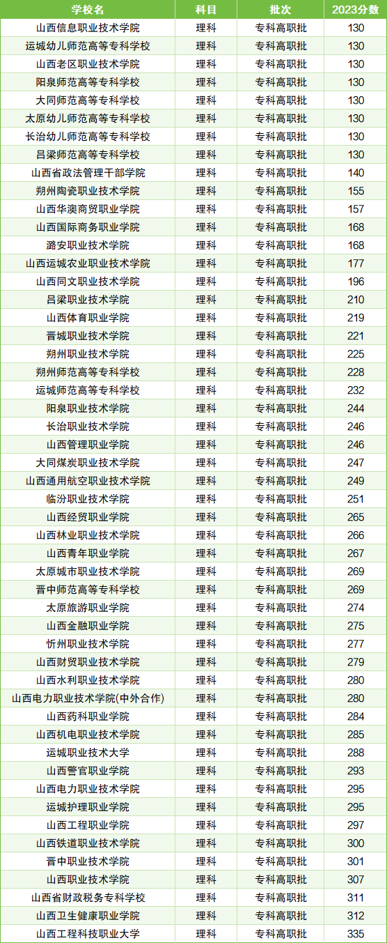 2023年山西省内大专理科分数范围在130分~335分之间,其中压专科线(130分)能报考的院校有8所,包括山西信息职业技术学院、运城幼儿师范高等专科学校、阳泉师范高等专科学校、大同师范高等专科学校等。