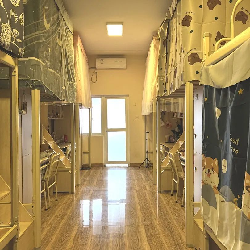 宿舍有六人间、四人间。四人间是上下床,两人是上床下桌,有空调。