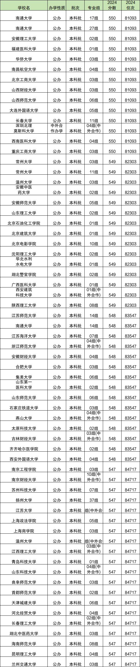 8万-8.5万名中最低位次对应的大学是海南师范大学、昆明理工大学等20所,最低录取位次为84717位,位次对应分数为547分。