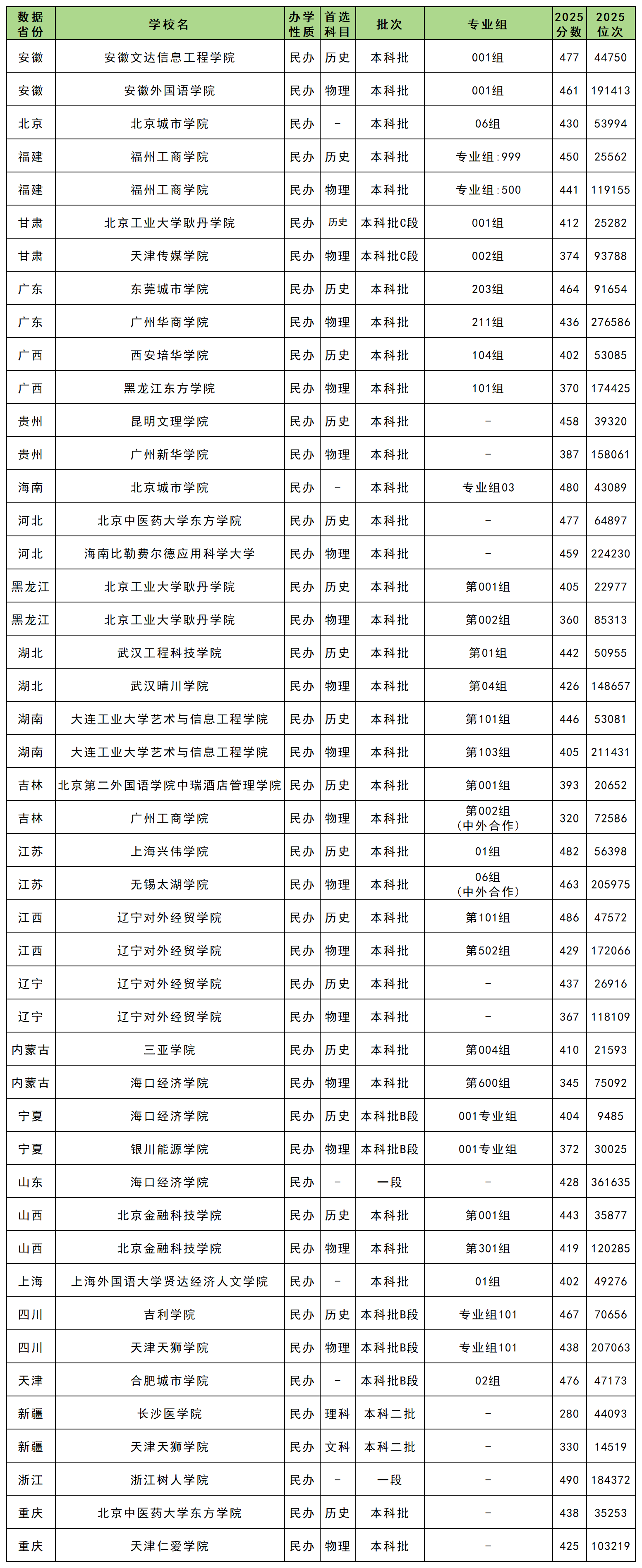 2025年各省民办二本大学最低录取分数线及各省最好考的民办二本大学名单一览表如下: