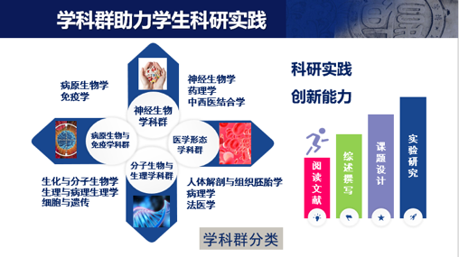 基础医学分为四个学科群,分别是病原生物与免疫学科群、神经生物学科群、医学形态学科群、分子生物与生理学科群。通过科研实践,创新培养,将强基计划的优秀人才打造成未来能够担当重任的医学科学家。
