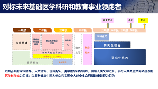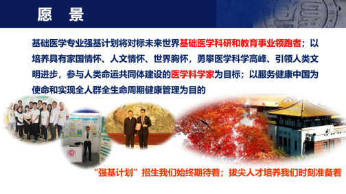 基础医学专业强基计划将对标未来世界基础医学科研和教育事业领跑者;以培养具有家国情怀、人文情怀、世界胸怀,勇攀医学科学高峰、引领人类文明进步,参与人类命运共同体建设的医学科学家为目标;以服务健康中国为使命和实现全人群全生命周期健康管理为目的。