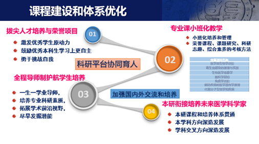 在整合课程之外,基础医学院开设了器官系统知识模块课程、前沿与交叉课程、实验实践核心课程。通过形态学、功能学、分子生物学等领域核心技术的学习和掌握,优秀学生可以在校内外、国内外实验室轮转,在导师指导下开展课题研究,接受科研思维和实践能力训练。