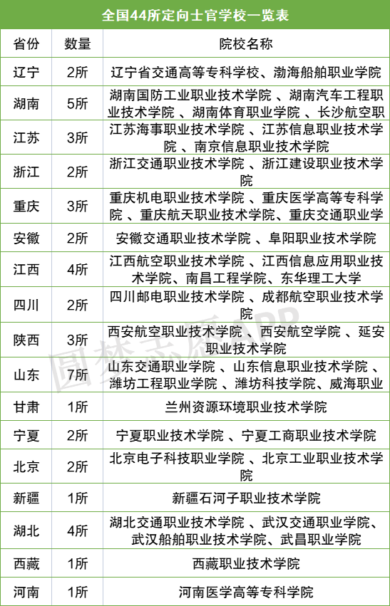 我国培养定向士官的院校就是一般地方普通院校,并非专门的士官院校。目前我国共有44所定向培养士官学校,分布在全国的17个省市;其中山东以7所的数量位居第1,排名第2的是湖南,共有5所;再次是湖北和江西,共有4所。
