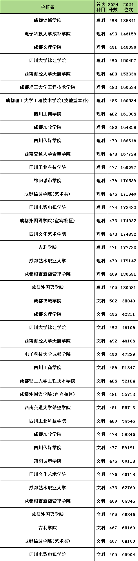 2024年四川民办二本最低录取分数线理科是469分,分数线最低的学校是成都银杏酒店管理学院、成都外国语学院。文科最低分是465分,分数线最低的学校是四川电影电视学院。