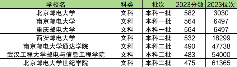 文科考生比较推荐西安邮电大学(532分)、南京邮电大学(564分)、重庆邮电大学(564分)、北京邮电大学(582分),都是在文科中分数比较低的公办邮电大学,最低超过二本线74分就能上。