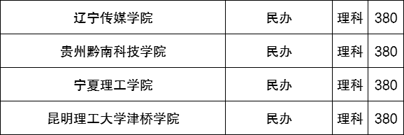 2024年本科大学理科最低录取分数线是380分,最好考的学校有昆明理工大学津桥学院、宁夏理工学院、贵州黔南科技学院、辽宁传媒学院。