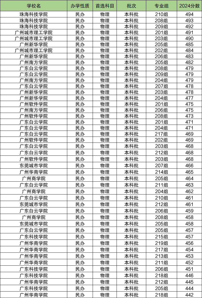 2024年广东十大民办大学物理类招生分数线范围在442分~494分之间,物理类考生至少要达到本科线(442分)才能报考。