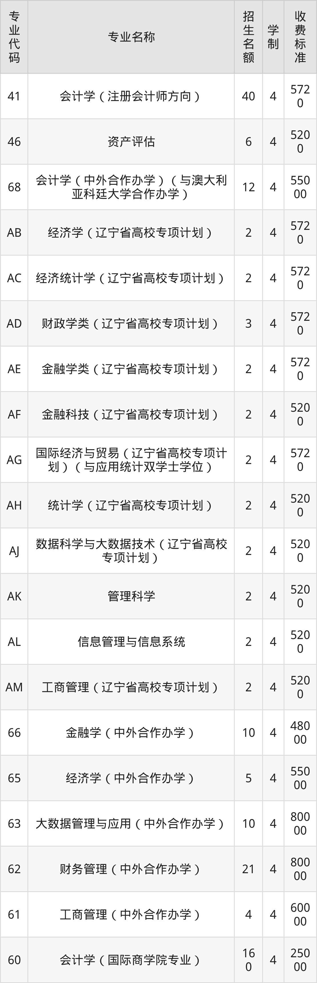 | AD | 国际经济与贸易(辽宁省高校专项计划) | 2 | 4 | 5720 |