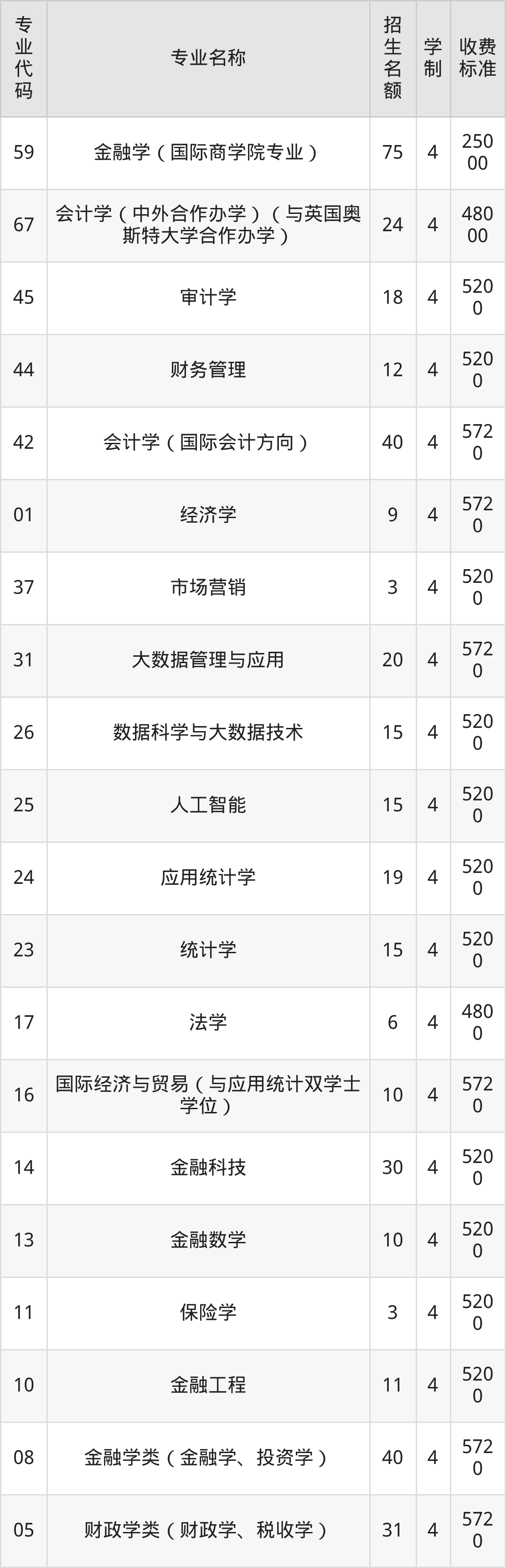 | 59 | 金融学(国际商学院专业) | 55 | 4 | 25000 |