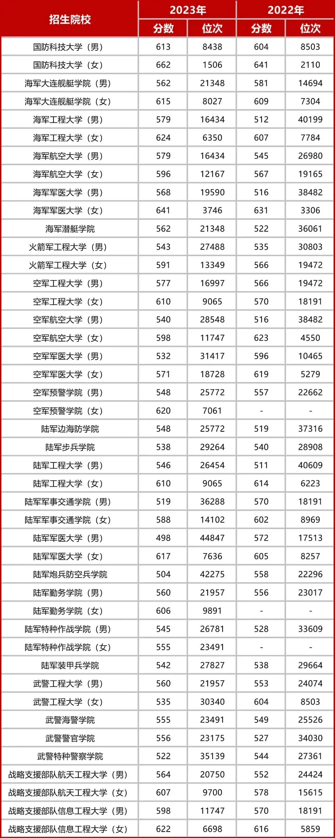 结合不同省份的提前批军校招生录取情况来看,500分的军校有陆军军医大学、陆军炮兵防空兵学院、陆军步兵学院、陆军军事交通学院、空军预警学院等院校。本文将为大家整理2023年军校录取分数线,一起来看看多少分能上军校吧!