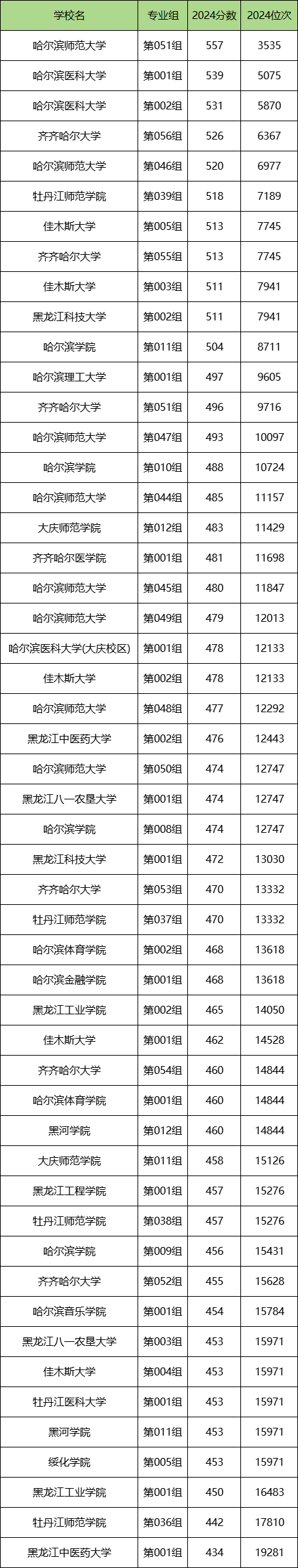 其中,分数线排名第一的公办二本大学是哈尔滨师范大学第051组(557分),除此之外,收分较高的院校还有:哈尔滨医科大学第001组(539分)、哈尔滨医科大学第002组(531分)、齐齐哈尔大学第056组(526分)、哈尔滨师范大学第046组(520分)。