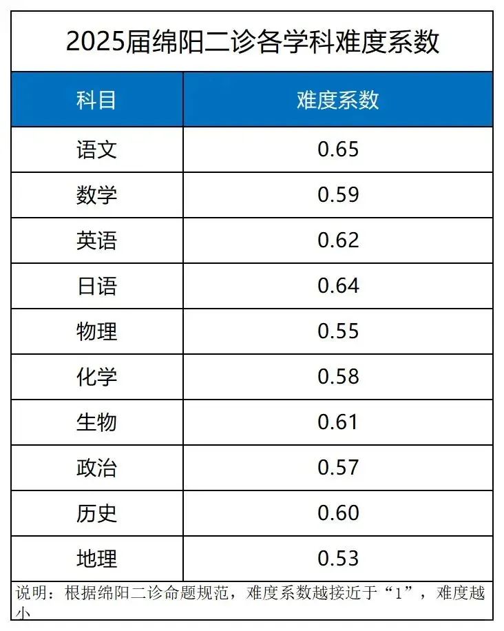 而历年高考难度系数一般在0.55-0.6之间,相比之下,绵阳二诊部分科目的难度与高考相近,部分科目难度略高于高考,如地理。