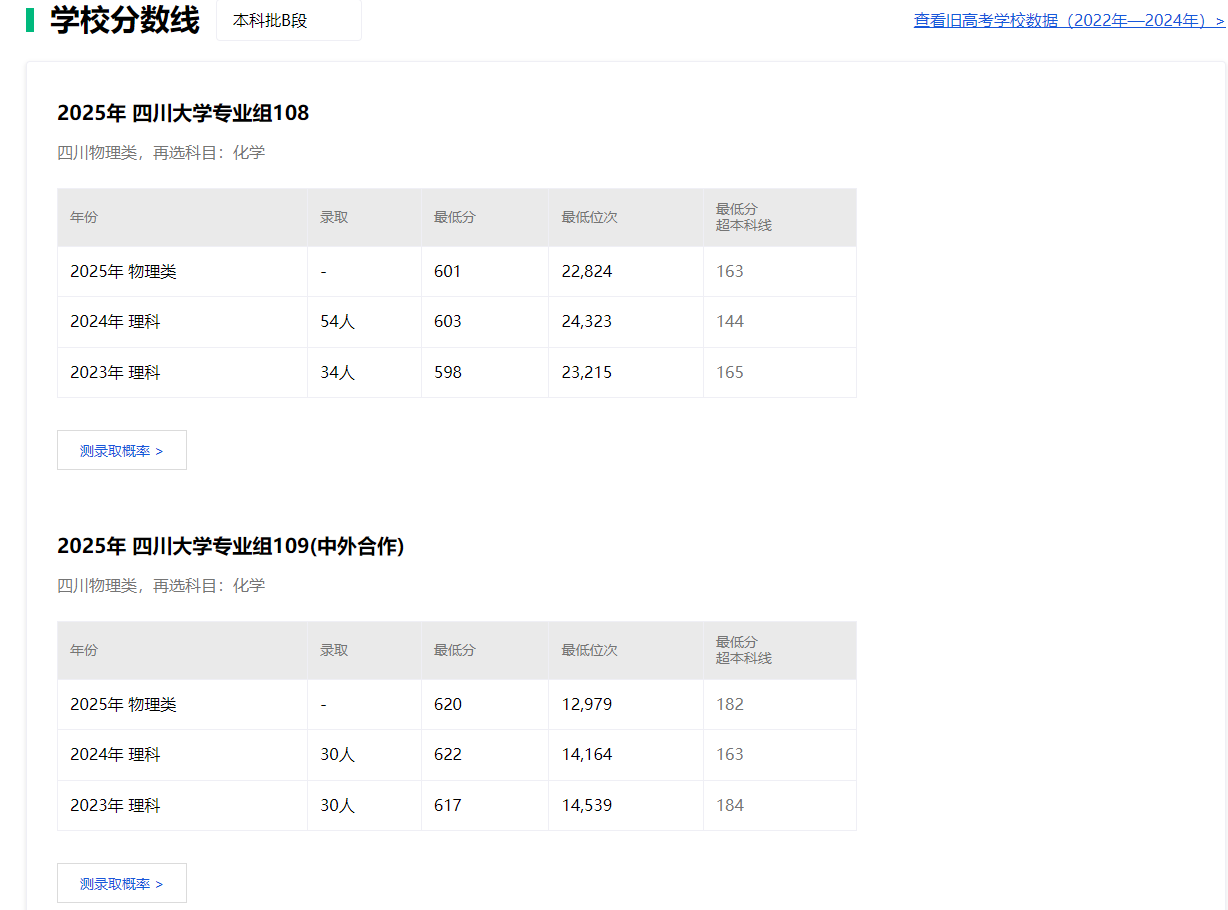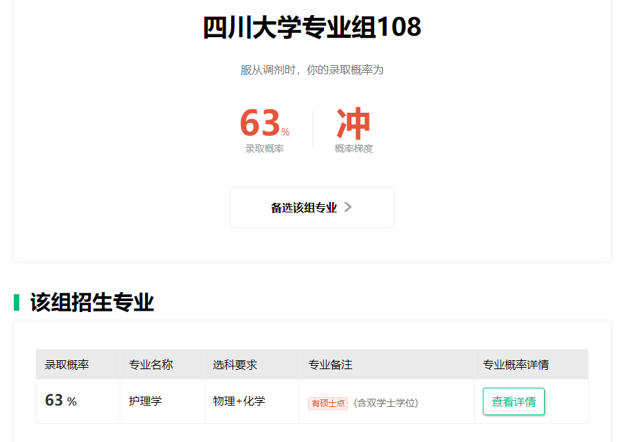 除此之外,还为大家提供每所大学的测录取概率,目的就是为了能够让考生知道自己与目标院校之间的差距。比如重庆物化生600分考生想要报考四川大学108组,点击测录取概率,系统便根据近三年的分数变化,为大家提供被四川大学录取的概率以及专业组内专业的录取概率。