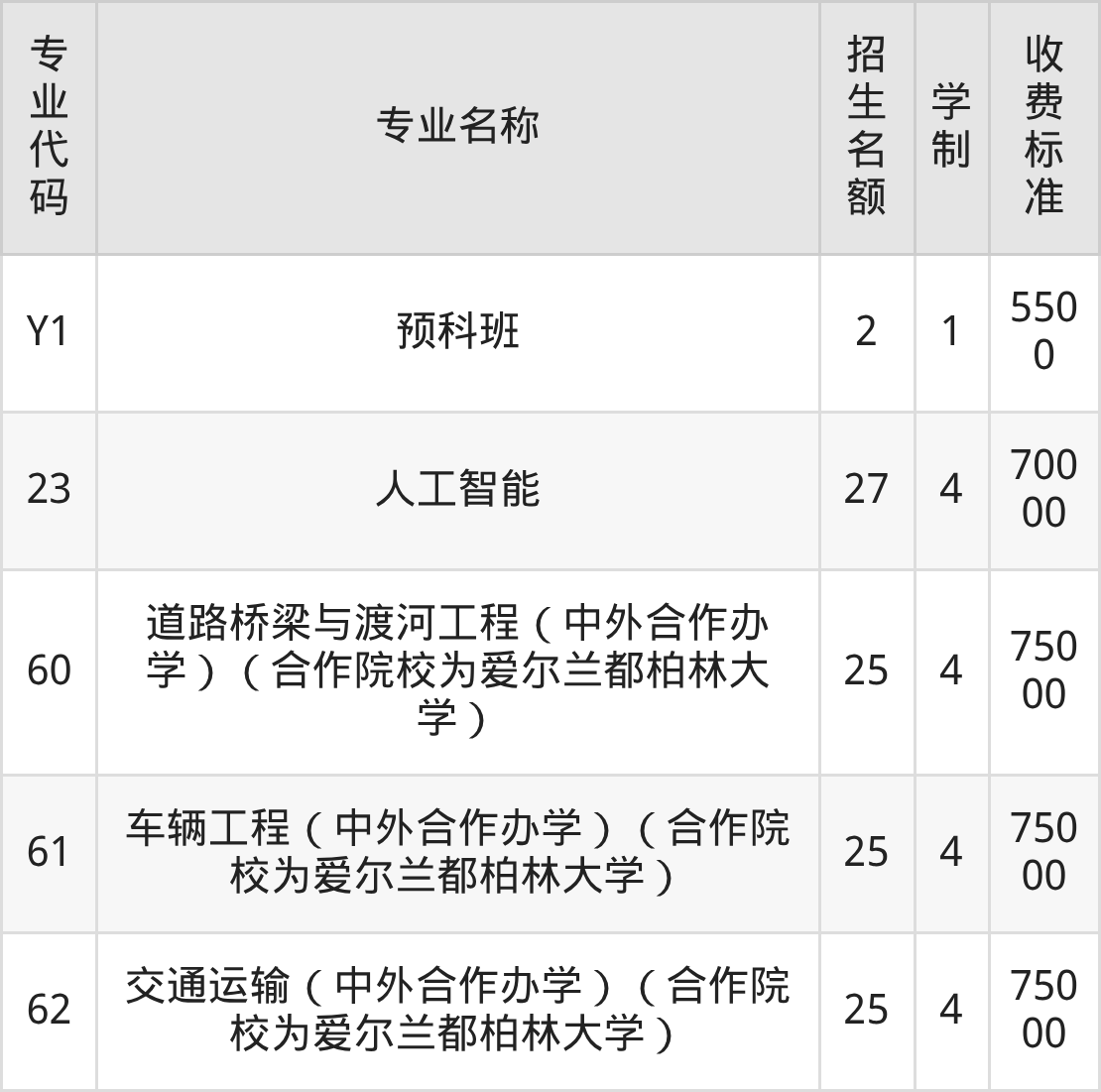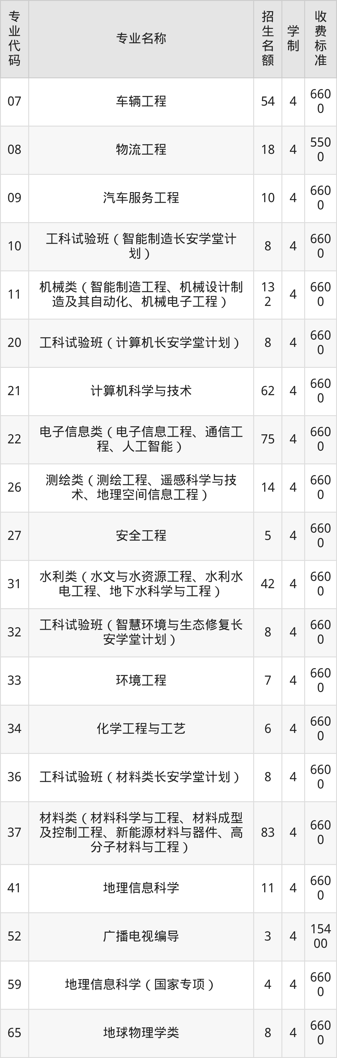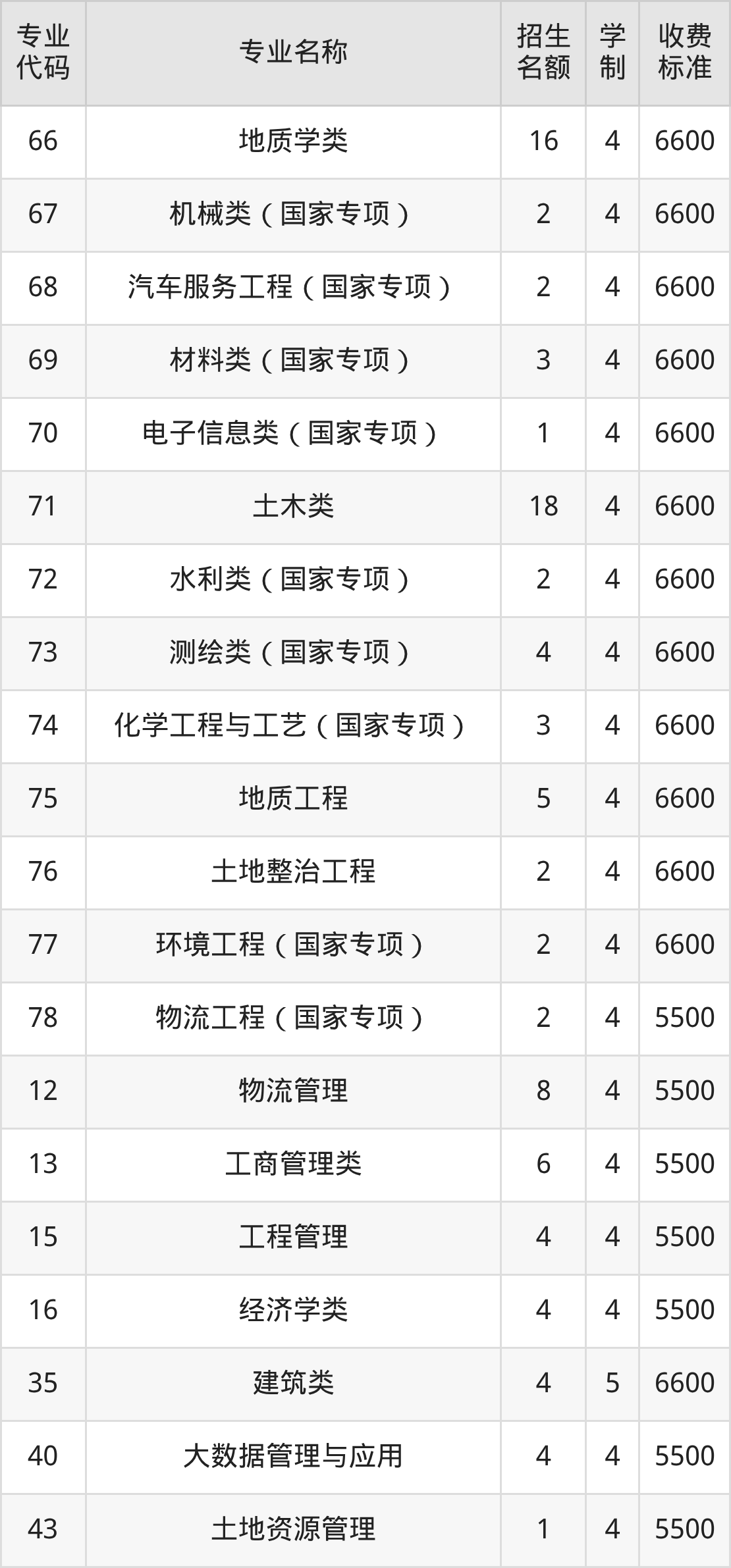 | 专业 代码 | 专业名称 | 招生 名额 | 学 制 | 收费 标准 |