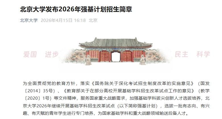2026年北京大学强基计划招生简章已于4月15日公布,该校强基报名时间为4月15日至4月30日(竞赛考生截止时间为4月23日),招生专业包含数学类、物理学类、化学类、基础医学(八年制)、考古学、历史学类等。