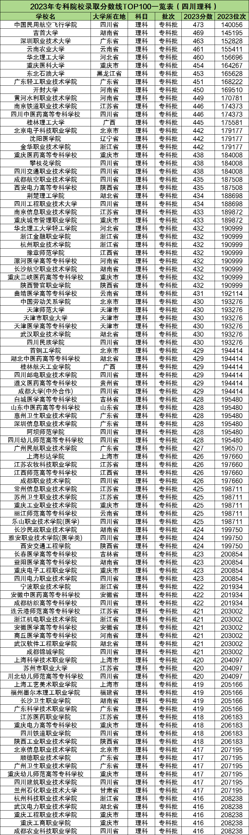 以下是2023年专科院校在四川省理科的录取分数线TOP100一览表: