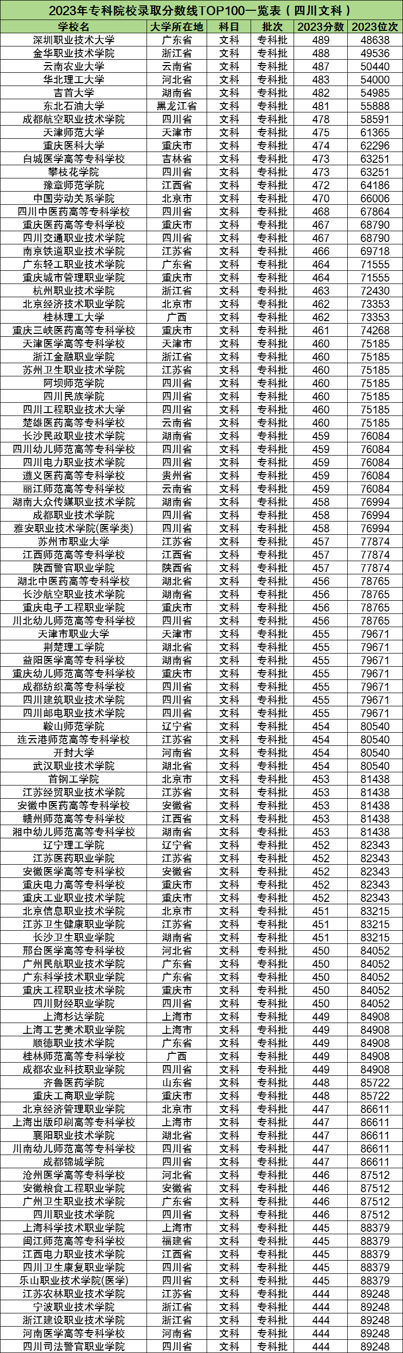 以下是2023年专科院校在四川省文科的录取分数线TOP100一览表: