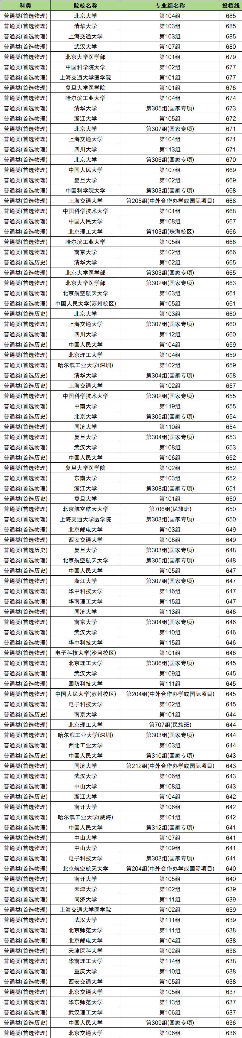 物理类收分最高的为北京大第104组、清华大学第103组和上海交通大学第103组,最低投档线均为685分;收分最低的为福建商学院第902组(边防军人子女预科班)。
