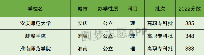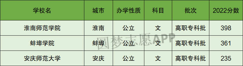 2022年在安徽省理科专科最低分数为385分,文科专科最低分为235分。