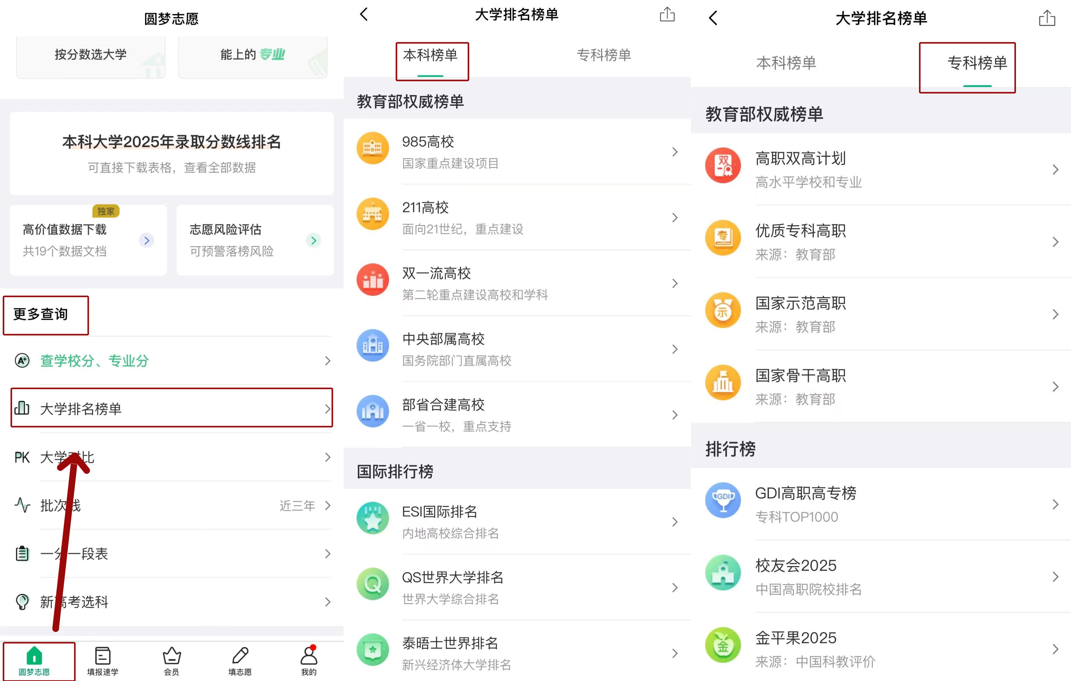 圆梦志愿app提供多个权威排行榜的最新完整院校排名,包括教育部权威榜单、国内外常用排行榜。进入某排行榜后,用户还可按位置与院校类型来筛选院校。