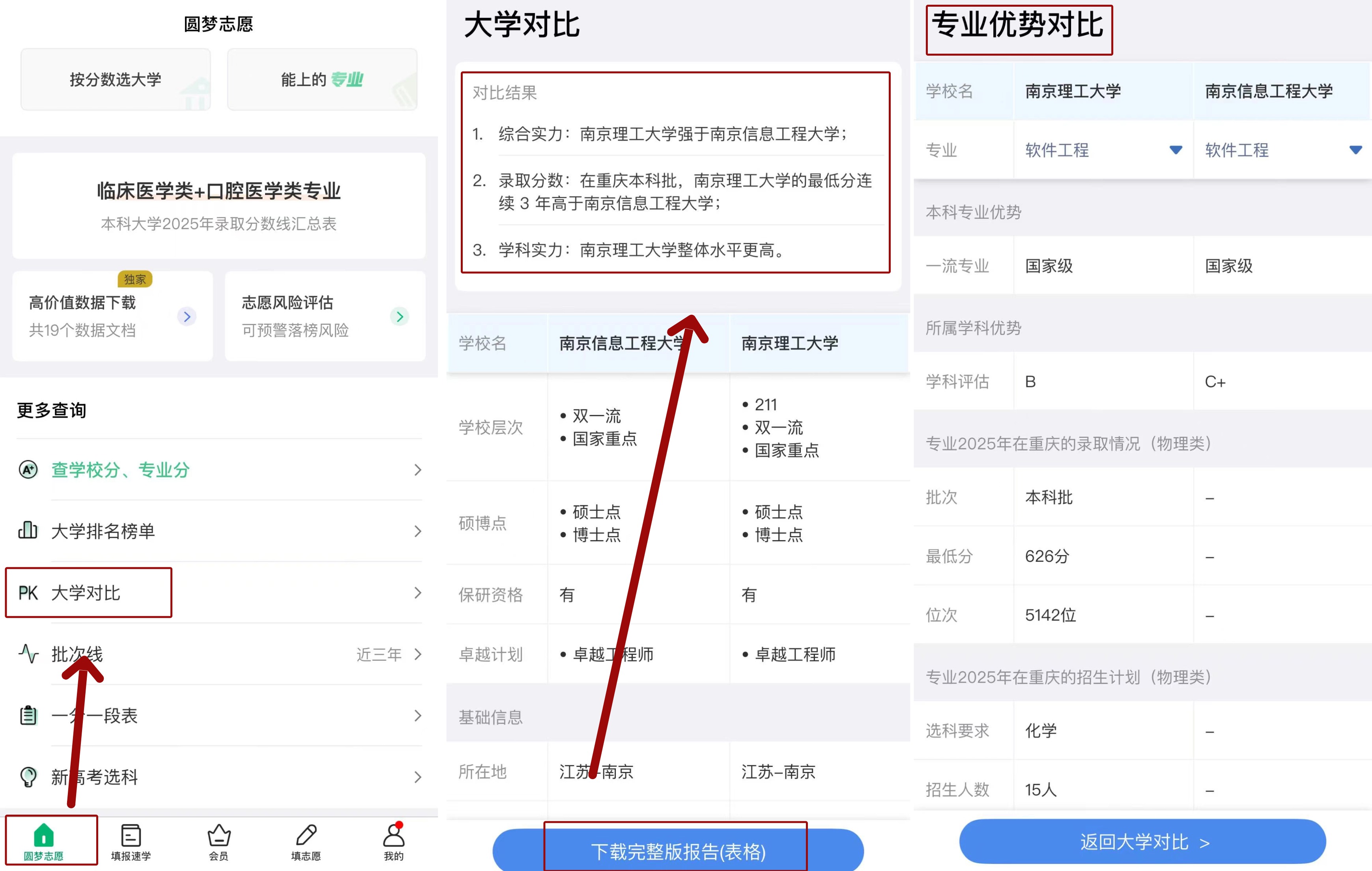 圆梦志愿app支持添加两所高校进行多维度对比,对比内容涵盖国内外排名、升学就业情况、学科评估结果、近三年录取分数线等。该功能同时支持院校与专业对比,用户还可下载完整报告,便于离线查阅。