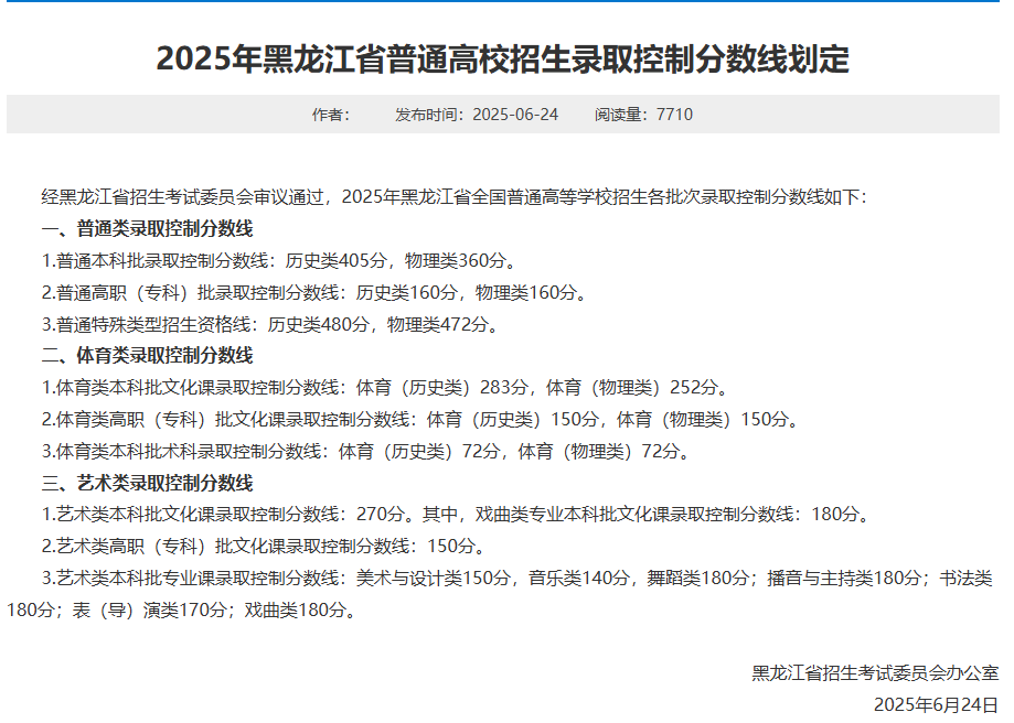2025年黑龙江本科划线6月24日由黑龙江省教育考试院公布: