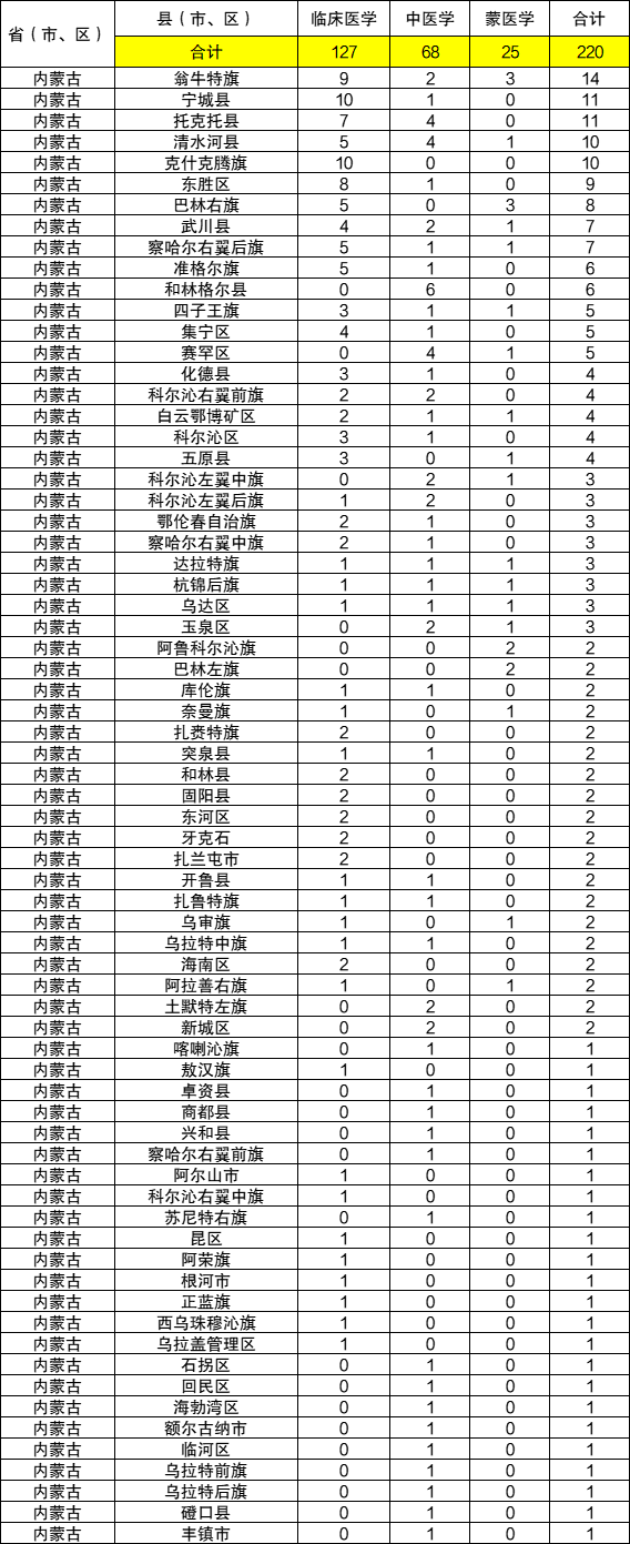 察哈尔右翼后旗:共计7人,其中临床医学5人,蒙医学1人,中医学1人。