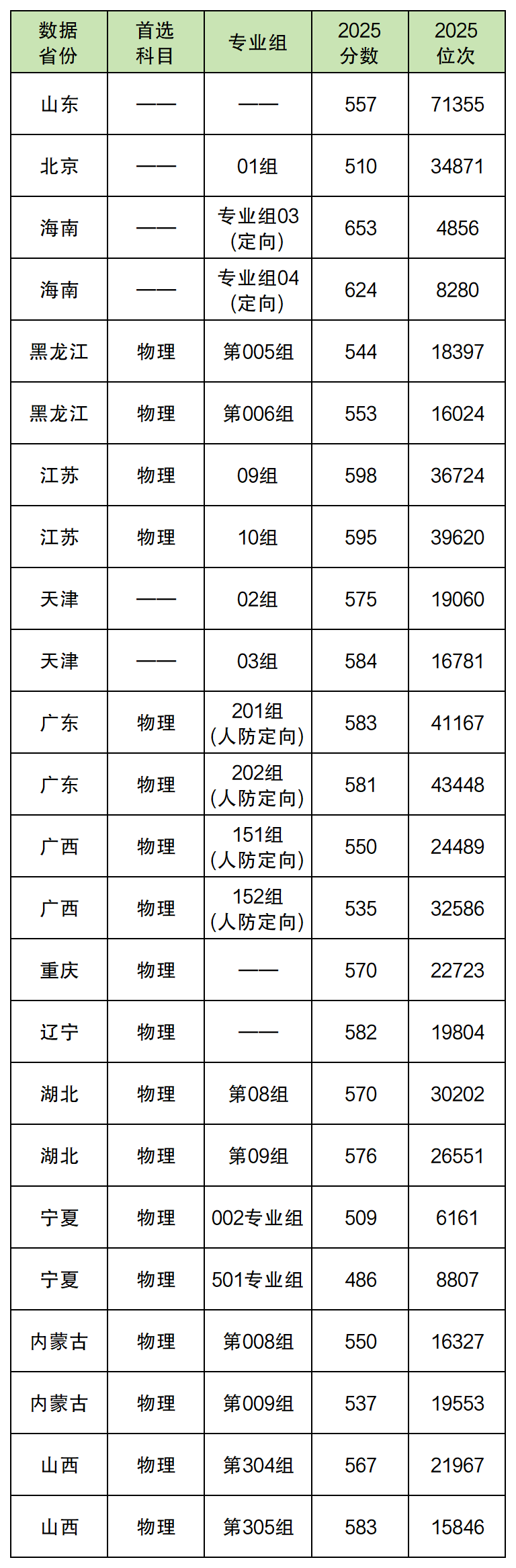 2025年陆军工程大学在全国本科批的录取分数线位于486分~653分之间,在14个地区招生,具体的分数线如下: