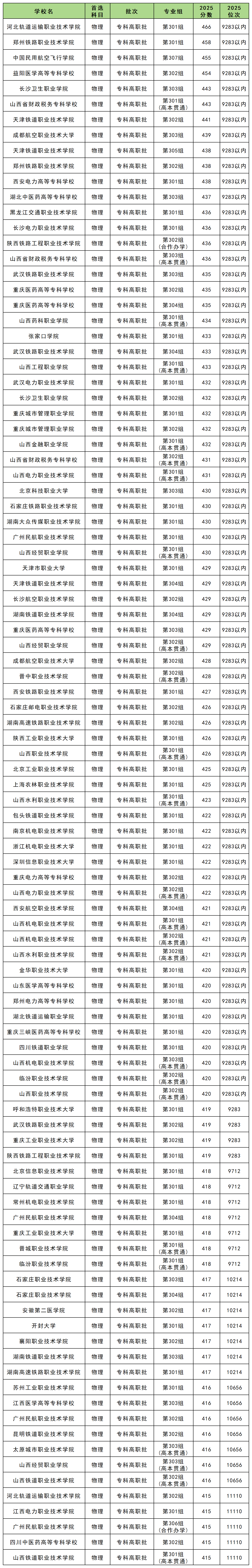 如下为各位展示的是2025年山西物理组公办专科院校的Top100录取分及位次情况: