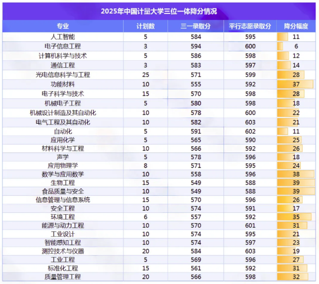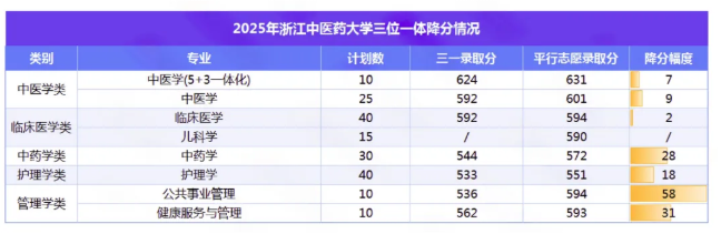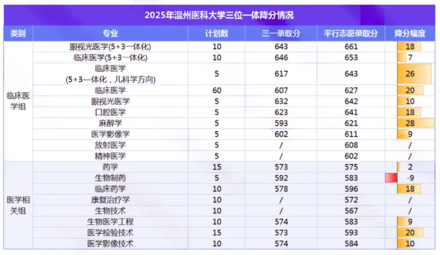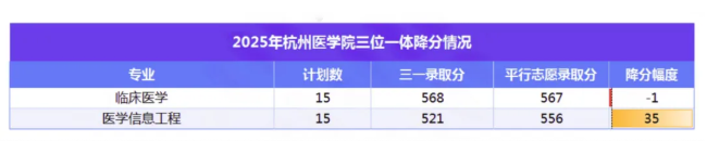 2025年三位一体录取分数线:临床医学568分,未降分录取;医学信息工程521分,降分35分。