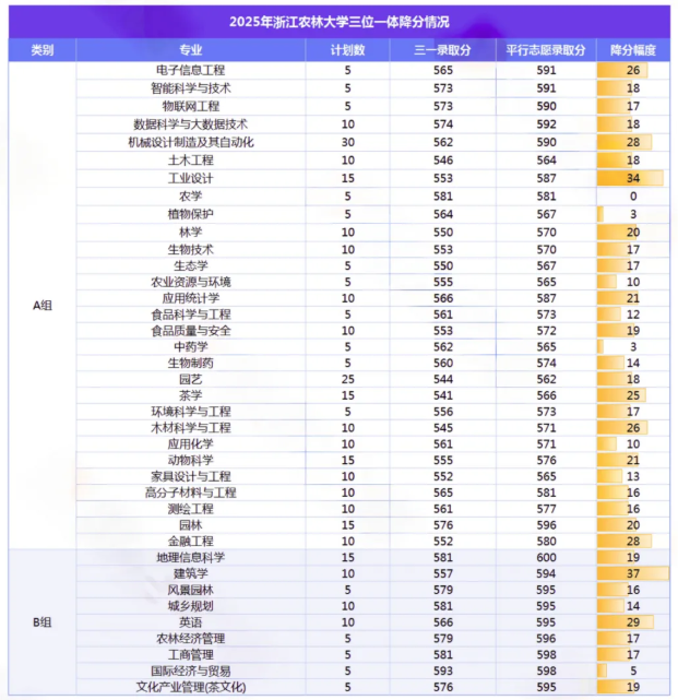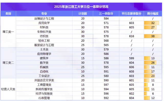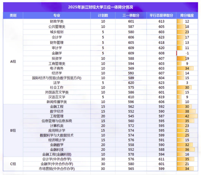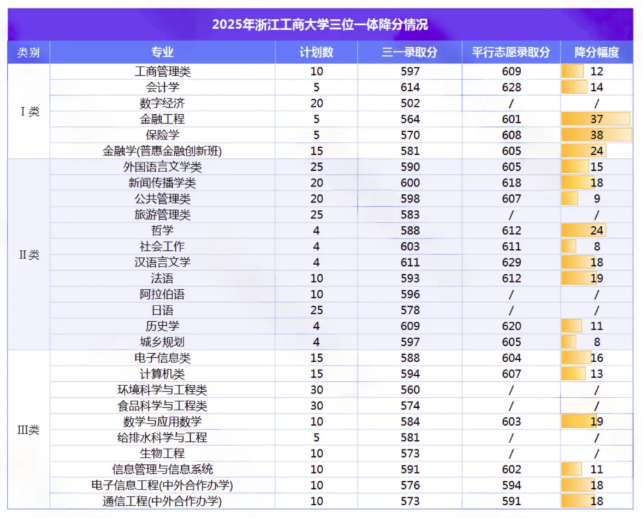2025年浙江工商大学三位一体录取分数线:工商管理类597分、保险学570分、电子信息类588分、生物工程573分等。